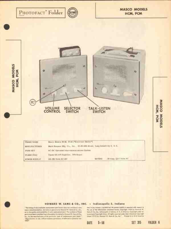 Vintage MASCO models HCM and PCM intercommunication intercom system. Original old Sams Photofact manual includes schematic, layout, alignment instructions, voltage & resistance test chart, repair parts list and description. 4 pages. Dated 1956. Mark Simpson Manufacturing Company, Inc. of Long Island City, NY. This manual would make a sensational accompaniment to your retro classic office equipment.