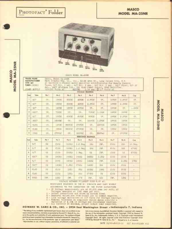 Vintage MASCO model MA-25NR 9 tube 4 channel audio amplifier. Original old Sams Photofact manual includes schematic, layout, voltage & resistance charts, repair parts list. 4 pages. Dated 1948. Mark Simpson Mfg. Company, Inc. of Long Island City, NY. This manual would make a sensational accompaniment to your vintage audio equipment.