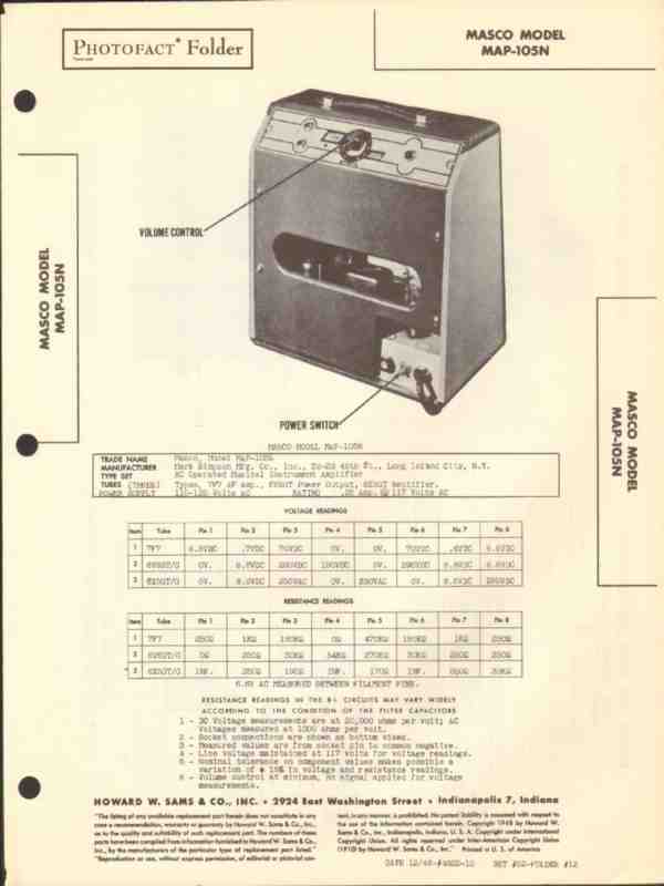 Vintage MASCO model MAP-105N musical instrument audio amplifier. Original old Sams Photofact manual includes schematics, layouts, voltage & resistance readings, parts list. 4 pages. Dated 1948. Mark Simpson Mfg. Company, Inc. of Long Island City, NY. This manual would make a sensational accompaniment to your vintage audio equipment.