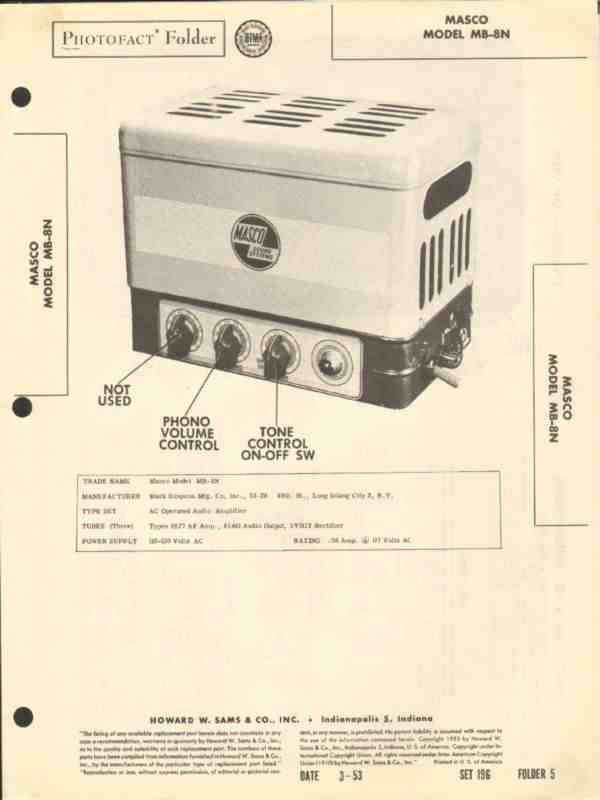 Vintage MASCO model MB-8N 3 tube audio amplifier. Original old Sams Photofact manual includes schematics, layouts, voltage & resistance readings, parts list. 4 pages. Dated 1953. Mark Simpson Mfg. Company, Inc. of Long Island City, NY. This manual would make a sensational accompaniment to your vintage audio equipment.