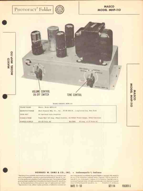 Vintage MASCO model MHP-110 4 tube audio amplifier. Original old Sams Photofact manual includes schematic, layouts, alignment info, repair parts list. 4 pages. Dated 1950. Mark Simpson Mfg. Company, Inc. of Long Island City, NY.