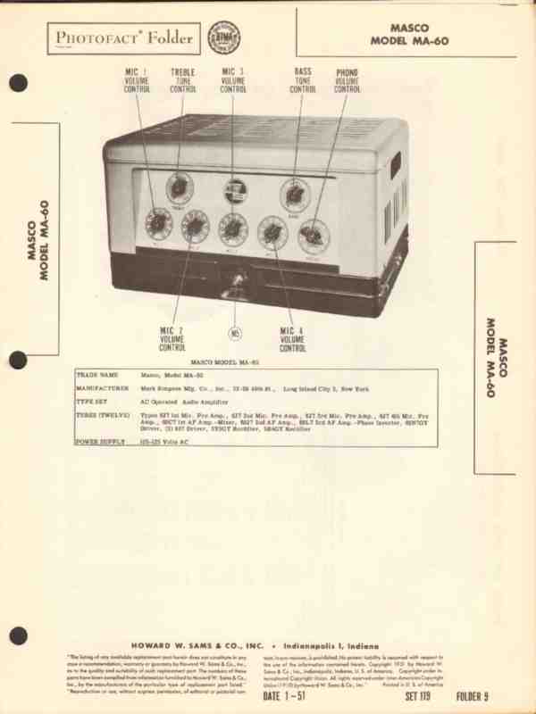 Vintage MASCO models MA-60 12 tube audio amplifier. Original old Sams Photofact manual includes schematic, layout, voltage & resistance charts, repair parts list, 6 pages. Dated 1951. Mark Simpson Manufacturing Company, Inc. of Long Island City, NY.