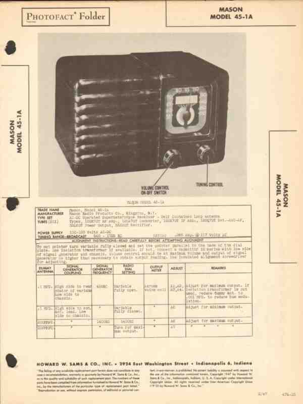 mason model 45-1a 6 tube am radio receiver sams photofact manual