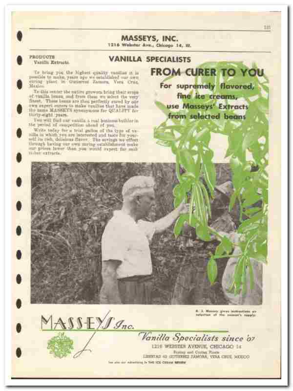 To bring you the highest quality vanillas it is possible to make, years ago we established our own curing plant in Gutierrez Zamora, Vera Cruz, Mexico. To this center the native growers bring their crops of vanilla beans, and from them we select the very finest. These beans are then perfectly cured by our own expert curers to make vanillas that have made the name Masseys synonymous for quality for 38 years. You will find our vanilla a real business builder in the period of competition ahead of you.