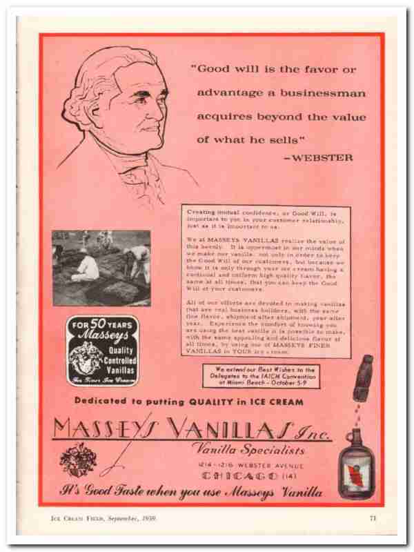 Original ice cream trade magazine vintage ad for MASSEYS VANILLAS, INC. Main office and factory was located at 1214-1216 Webster Avenue, Chicago, IL. Vanilla Specialists. Webster quality, flavor. Good will is the favor a businessman acquires beyond the value of what he sell. All of our efforts are devoted to making vanilla that is real business builders, with the same fine flavor, shipment after shipment, year after year. This unique 1959 old dairy industry magazine advertisement would display wonderful matted and framed. Nice graphics.