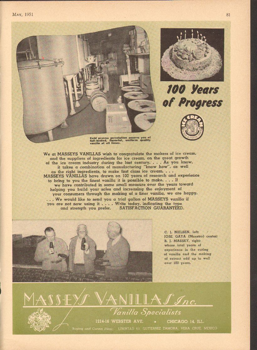 Original ice cream trade magazine vintage ad for MASSEYS VANILLAS, INC., Main office and plant was located at 1214-1216 Webster Avenue, Chicago, IL. Manufacturers of Vanilla Flavor. 100 Years of Progress. Pictured are Mr C.J. Nielson, Mr Jose Gaya, Maestro, and Mr R.J. Massey. We at Masseys Vanillas Wish to Congratulate the Makers of Ice Cream and the Suppliers of Ingredients for Ice Cream on the Great Growth of the Ice Cream Industry during the Last Century. This unique 1951 old dairy industry magazine advertisement would display wonderful matted and framed. Nice graphics.