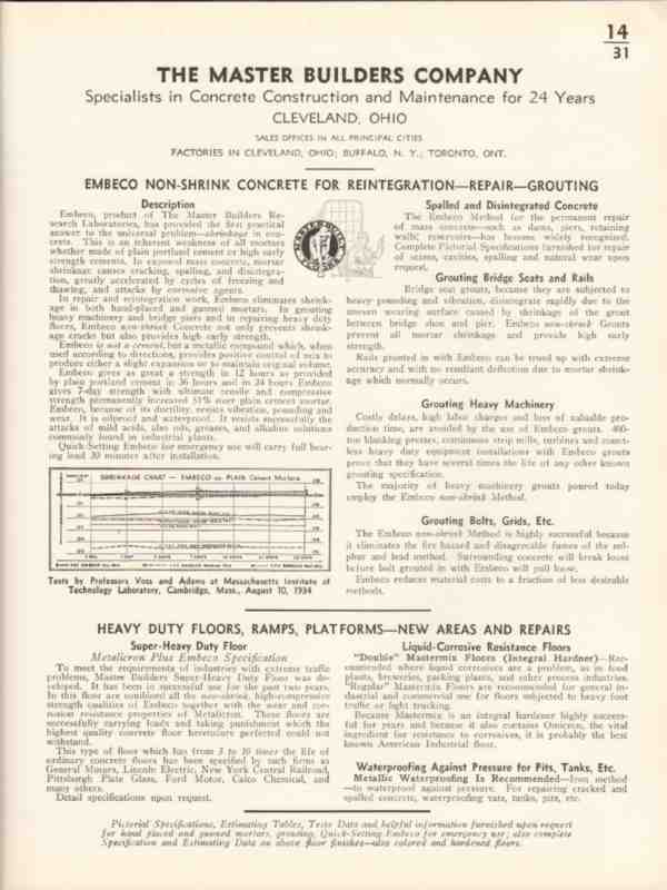 Original concrete trade vintage catalog for THE MASTER BUILDERS COMPANY of Cleveland, OH. Manufacturers of Embeco Concrete Heavy Duty Floors, Ramps, Platforms, Repair and Grouting. This unique 1936 old one page technical engineering data brochure would display beautifully matted and framed. A nice addition to your retro architectural library.