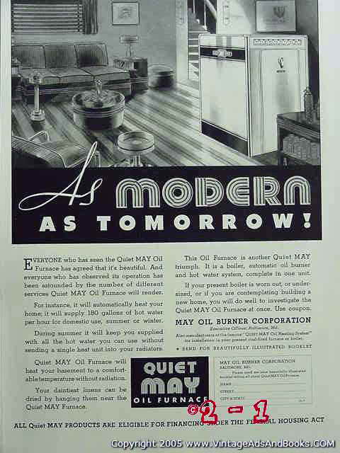Original vintage magazine ad, MAY OIL BURNER CORPORATION, "Quiet May Oil Furnace". Old 1935 heating advertisement.