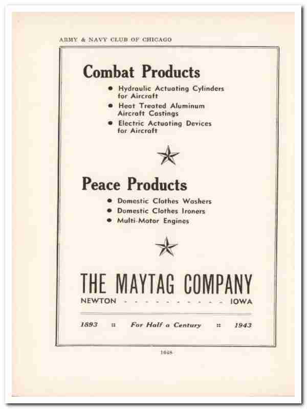 Original wartime vintage ad for THE MAYTAG COMPANY. Combat Products for aircraft made during WW2 such as hydraulic actuating cylinders, heat treated aluminum castings, and electric actuating devices. Peace time products include domestic clothes washers, ironers, multi-motor engines.