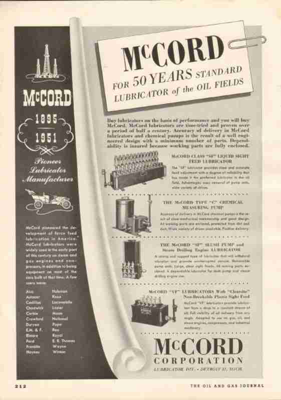 Original oil and gas trade magazine vintage ad for McCORD CORPORATION, Lubricator Division, of Detroit, MI.  McCord For 50 Years Standard Lubricator of the Oil Fields. McCord Class SF Liquid Sight Feed Lubricator, The McCord Type C Chemical Measuring Pump, The McCord SP Slush Pump and Steam Drilling Engine Lubricator, McCord VF Lubricators with Clearsite Non-Breakable Plastic Sight Feed. Unique 1951 old oilfield petroleum equipment lubrication industry magazine advertisement. Nice graphics. Approximate size  9  x 12 inches.