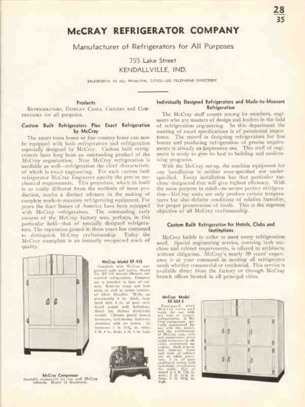 Original appliance trade vintage catalog for McCRAY REFRIGERATOR COMPANY. Main office and plant was located at 755 Lake Street, Kendallville, IN. Display Cases, Coolers and Compressors. McCray Model RF-418, Model RE-664-S, Custom built for hotels, clubs and institutions. Manufacturer of Refrigerators for All Purposes. Disbound from a large 1938 construction equipment book, this unique old one page appliance technical data specification sheet brochure would display wonderfully matted and framed. A marvelous addition to your retro architecture and engineering library.