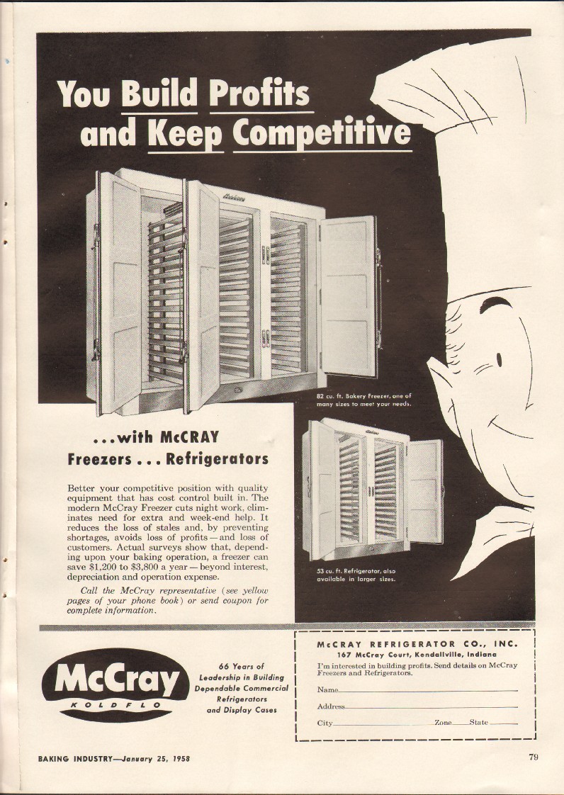 Original commercial bakery trade magazine vintage ad for MCCRAY REFRIGERATOR COMPANY, INC in Kendallville, IN. You build profits and keep competitive with McCray freezers, refrigerators and display cases. 1958 unique old baking industry equipment advertisement.