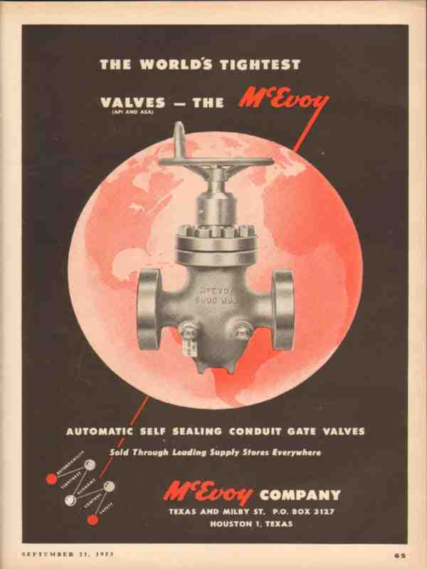 Original oil and gas trade magazine vintage ad for McEVOY COMPANY, was located on Texas at Milby Streets, Houston, TX.  The World's Tightest Self Sealing Valves. Automatic Self Sealing Conduit Gate Valve. This unique 1953 old oilfield petroleum well industry valve equipment magazine advertisement would display beautifully matted and framed. Nice graphics.
