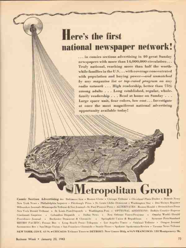 Original World War 2 media industry trade magazine vintage ad for METROPOLITAN GROUP of New York City, NY. Here's the First National Newspaper Network! In comics sections advertising in 40 great Sunday newspapers. Old 1943 WW2 era magazine advertisement.