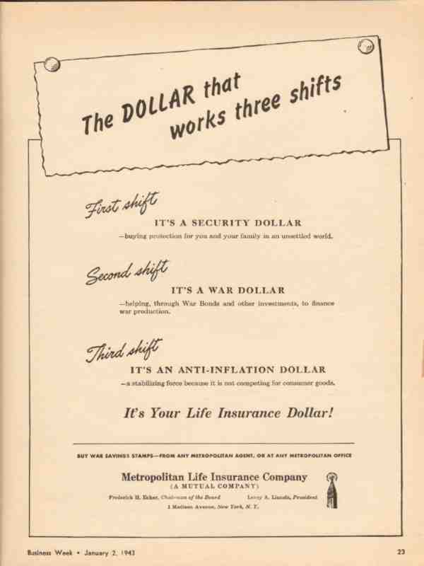 metropolitan life insurance 1943 dollar works three shifts vintage ad