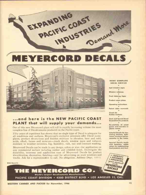 Original vintage food packing trade magazine ad for THE MEYERCORD COMPANY of Los Angeles, CA. Expanding Pacific Coast Industries Demand More Meyercord Decals. Pictured is the new Meyercord plant with the most complete line of Decalomania produced on the Pacific Coast. Old 1946 packaging and labeling advertisement.