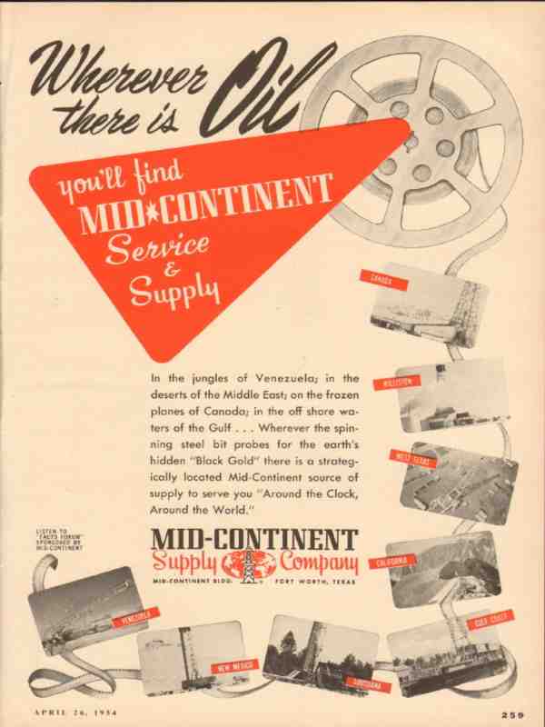 Original oil and gas trade magazine vintage ad for MID CONTINENT SUPPLY COMPANY of Fort Worth, TX.  Wherever There is Oil, You'll Find Mid-Continent Service & Supply.  This unique 1954 old petroleum oilfield and refining industry equipment advertisement would look fantastic matted and framed. Nice graphics.
