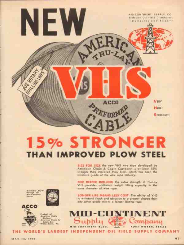Original oil and gas trade magazine vintage ad for MID-CONTINENT SUPPLY COMPANY of Fort Worth, TX. New VHS Stronger Cable Than Improved Plow Steel. Very High Strength developed by American Chain and Cable Company. This unique 1955 old oilfield petroleum drilling equipment industry magazine advertisement would display beautifully matted and framed. Nice graphics.