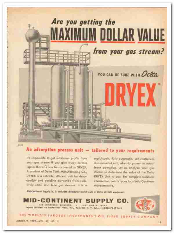 Original oil and gas trade magazine vintage ad for MID-CONTINENT SUPPLY COMPANY. Main office was located in Fort Worth, TX. Delta Dryex gas stream get the maximum dollar value. An adsorption process unit, tailored to your requirements. This unique 1959 old petroleum gas refining equipment magazine advertisement would display beautifully matted and framed. Nice graphics.