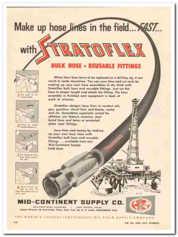 Original oil and gas trade magazine vintage ad for MID-CONTINENT SUPPLY COMPANY. Main office was located in Fort Worth, TX. Statoflex hose lines fast made up in the field. Designs lines to conduct oils, gas, gasoline, diesel fuel, anti-freeze, water and air. Assemblies especially suited for offshore use feature stainless steel braid hose and brass or protected plate steel fittings. This unique 1959 old oilfield petroleum drilling equipment magazine advertisement would display beautifully matted and framed. Nice graphics.