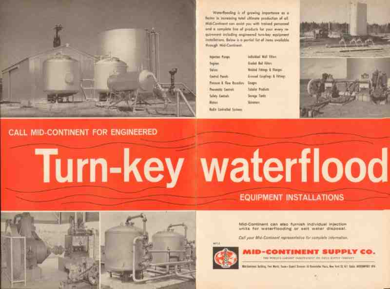 Original oil and gas trade magazine vintage ad for MID-CONTINENT SUPPLY COMPANY of Fort Worth, TX.  Engineered Turn-key waterflood equipment installations. Items include injection pumps, engines, valves, control panels, pneumatic controls, meters, well filters, gauges and storage tanks.  Mid-Continent can also furnish individual injection units for waterflooding or salt water disposal. This unique 1962 old oilfield petroleum industry well equipment advertisement would display beautifully matted and framed. Nice graphics. Two page gatefold advertisement.