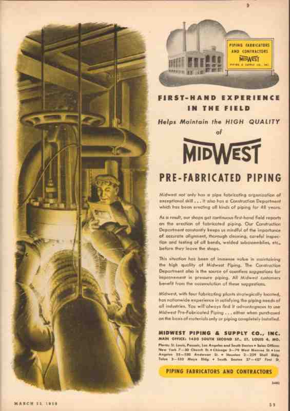 Original oil and gas trade magazine vintage ad for MIDWEST PIPING & SUPPLY COMPANY, INC was located at 1430 South Second Street, St Louis, MO. Pre-fabricated high quality piping. First-hand experience in the field. Four fabricating plants strategically located nationwide. This unique 1950 old oilfield petroleum pipeline industry equipment magazine advertisement would display beautifully matted and framed. Nice graphics.