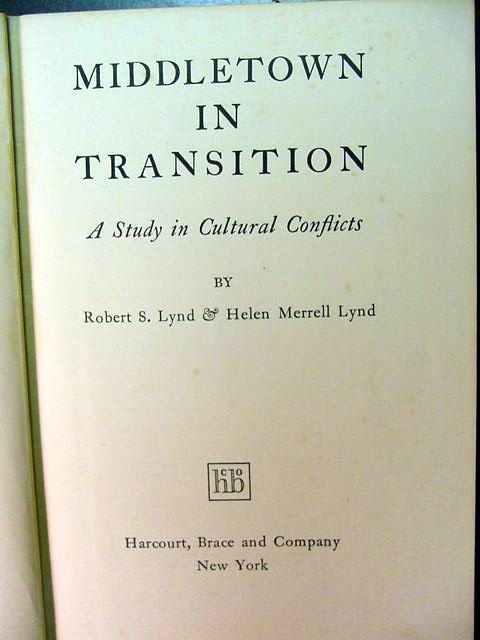 Hard covered book titled MIDDLETOWN IN TRANSITION, A Study in Cultural Conflicts by Robert S. Lynd & Helen Merrell Lynd, 1937, First Edition. 604 pages.