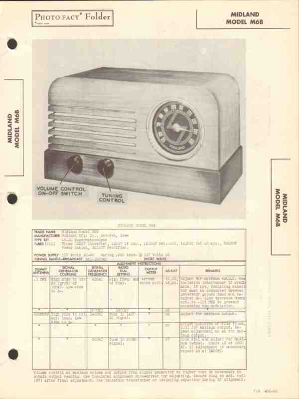 Vintage MIDLAND model M6B Superheterodyne 6 tube AM radio receiver. Original old Sams Photofact manual includes schematic, layout, alignment instructions, voltage & resistance test charts, repair parts list and description. Dated 1946. 4 pages. Midland Manufacturing Co., of Decorah, IA. This manual would make a sensational accompaniment to your classic retro radio equipment.