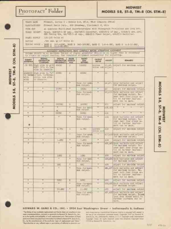 Vintage MIDWEST models S8, ST-8 and TM-8 (Ch. STM-8) 8 tube 5 band Superheterodyne AM SW radio receiver. Original old Sams Photofact manual includes schematic, layout, alignment instructions, voltage & resistance test charts, repair parts list and description. 6 pages. Dated 1947. Midwest Radio Corp. of Cincinnati, OH. This manual would make a sensational accompaniment to your classic retro radio equipment.