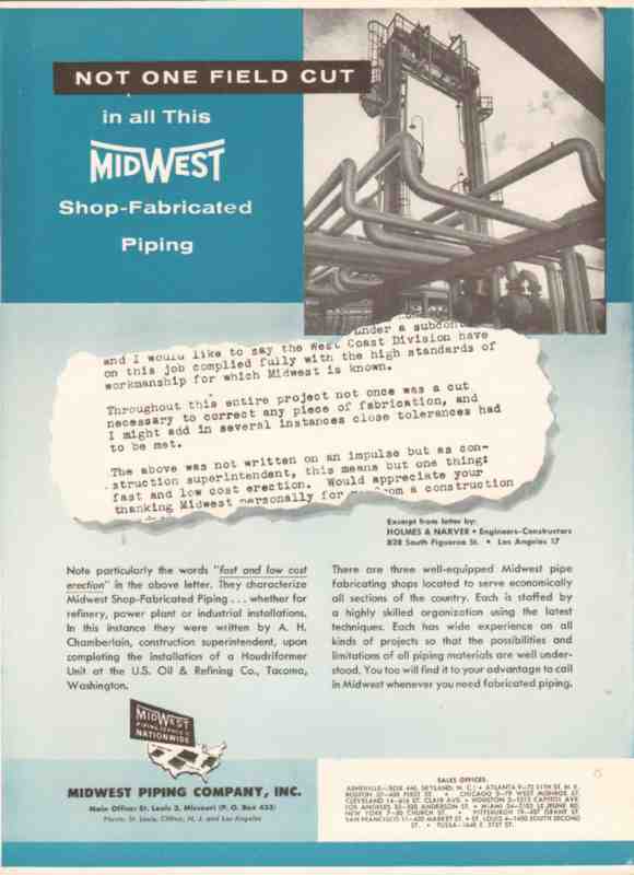 Original oil and gas trade magazine vintage ad for MIDWEST PIPING COMPANY, was located at 1450 South Second Street, St. Louis, MO. Not one field cut in all this shop-fabricated pipe. Shown is part of letter written by Mr A.H. Chamberlain, construction superintendent, upon completing the installation of a Houdriformer Unit at the US Oil and Refining Company in Tacoma, WA. This unique 1959 old oilfield petroleum equipment magazine advertisement would display beautifully matted and framed.