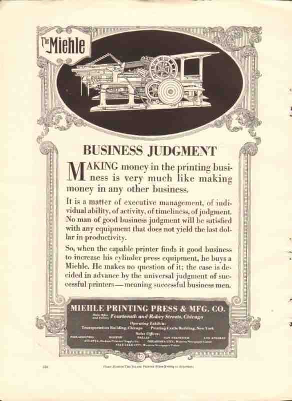 miehle printing press mfg company 1926 business judgement vintage ad