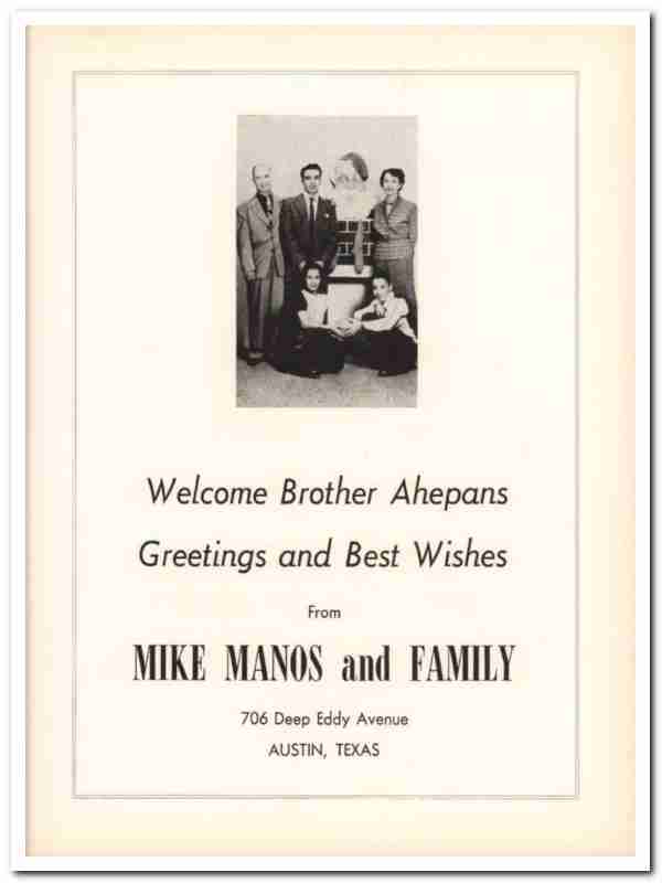 Original 1953 Greek-American business trade magazine vintage ad for MIKE MANOS & FAMILY. They were located at 706 Deep Eddy Avenue, in Austin, Texas. Welcome Brother Ahepans. Greetings and Best Wishes from Mike Manos and Family. Mike Manos Sr was a restaurant owner.