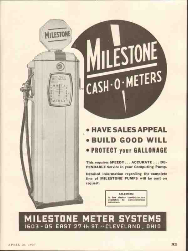 milestone meter systems 1937 cash-o-meters gasoline pump vintage ad