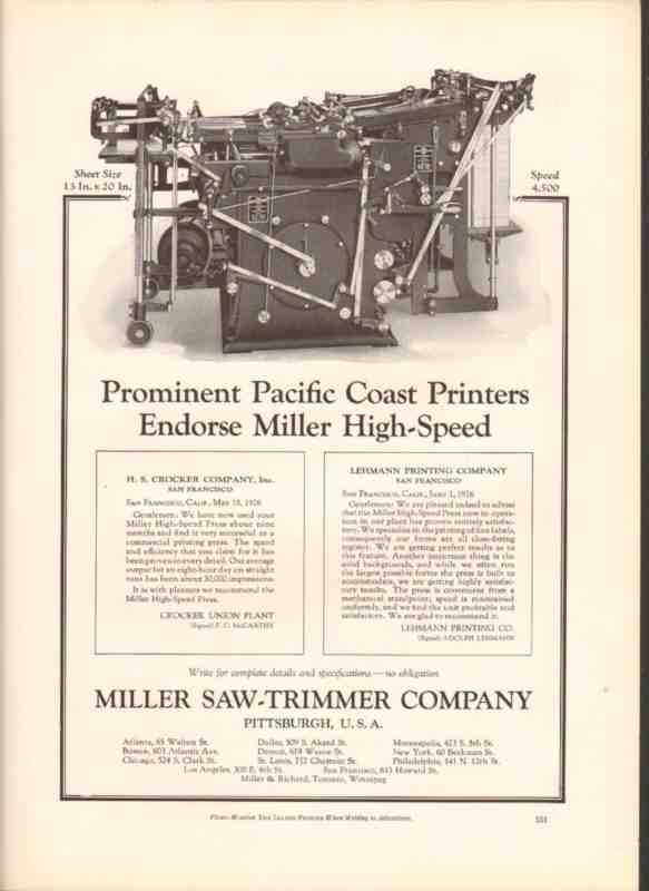 Original old printing magazine vintage ad for MILLER SAW-TRIMMER COMPANY in Pittsburgh, PA. Printers endorse Miller's high-speed press. H.S. Crocker Company and Lehmann Printing Co in San Francisco, CA.