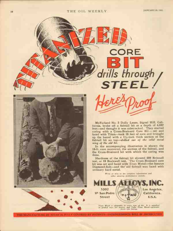 Original oil and gas trade magazine vintage ad for MILLS ALLOYS, INC. was located at 3202 South San Pedro Street, Los Angeles, CA. Titanized Core Bit Drills Through Steel! McFarland No. 3 Dolly Lease, Signal Hill, California broke off a fishtail bit at a depth of 4,087 feet and thought it was sidetracked. They started coring with a Crum-Brainard Core Bit set and faced with Titan, took 18 feet of core and brought up the barrel with a the section of the fishtail bit on top, drilled out of the solid metal wing of the old bit. This unique 1931 old oilfield petroleum drilling industry equipment magazine advertisement would display beautifully matted and framed. Great graphics. Art deco.