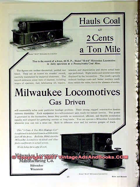 Original vintage mining magazine ad for MILWAUKEE LOCOMOTIVE MANUFACTURING COMPANY of Milwaukee, WI. Hauls Coal at 2 Cents a Ton Mile. Milwaukee Locomotives Gas Driven. Model M-5-0 in daily operation at a Pennsylvania Coal Mine. Old 1910 coal mining equipment industry advertisement. Would display beautifully matted and framed!