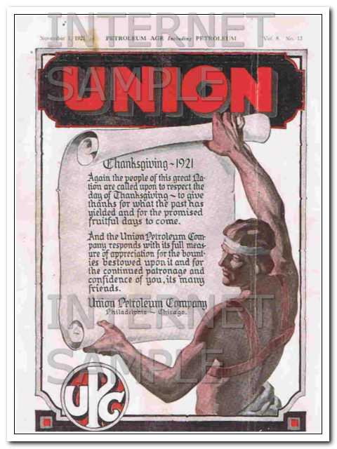 Original oil and gas trade magazine vintage ad for MILWAUKEE TANK WORKS of New York City, NY. A Commanding Personality Beautifully Architectured Type 361 Gasoline Station Curb Pump. Large chip off the bottom center of the page, but will This unique 1921 retail gas station industry magazine advertisement would display fantastic matted and framed. On the reverse side is an ad for UNION PETROLEUM COMPANY of Philadelphia, PA. Thanksgiving ad. Union Petroleum Company responds with its full measure of appreciation for the bounties bestowed upon it and for the continued patronage and confidence of your, its many friends. Unique 1921 old petroleum refining industry advertisement. Large chip on bottom edge, but would display fantastic when matted and frame. Great graphics. Approximate size 9 x 12 inches.