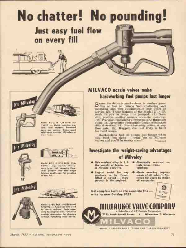 Original oil and gas service station industry trade magazine vintage ad for MILWAUKEE VALVE COMPANY of Milwaukee, WI. No Chatter, No Pounding Just Easy Fuel Flow On Every Fill with Milvaco Novel Valves. Old 1955 gasoline service station equipment magazine advertisement.