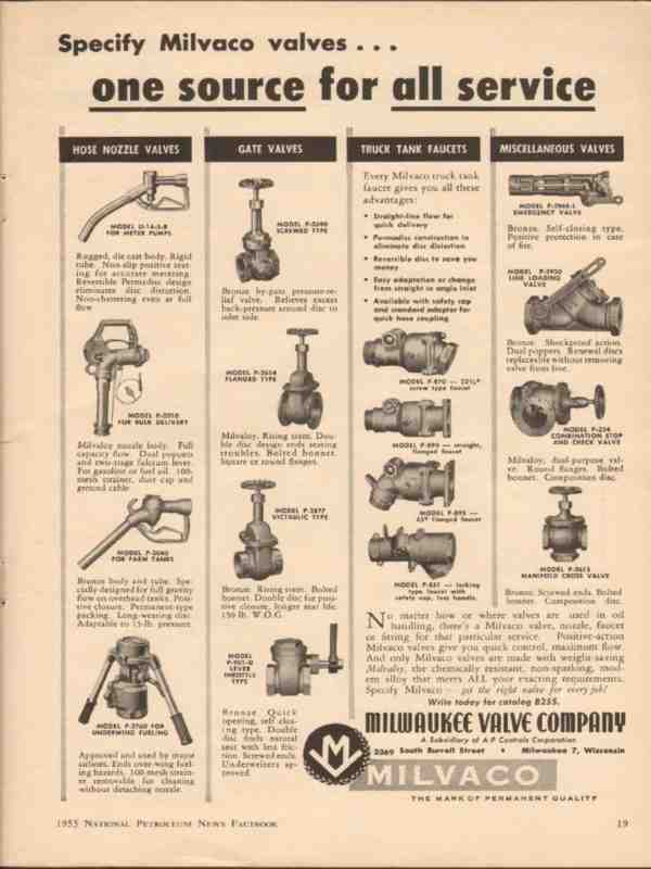 Original oil and gas trade magazine vintage ad for MILWAUKEE VALVE COMPANY, was located at 2369 South Burrell Street, Milwaukee, WI. Specify Milvaco Valves, One Source for All Service. Hose nozzle valves, gate valves and truck tank faucets. Unique 1955 old gasoline service station delivery equipment magazine advertisement. Nice graphics.