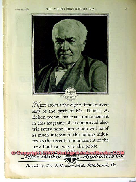 Original vintage mining magazine ad, MINE SAFETY APPLIANCES COMPANY of Pittsburgh, PA. On the 81st Anniversary of the birth of Mr. Thomas Alva Edison, We will make an Announcement int this magazine of his improved Electric Safety Mine Lamp which will be of as much interest to the mining industry as the recent announcement of the new Ford car was to the Public. Old 1928 dated coal mining industry advertisement. Would look fantastic matted and framed.