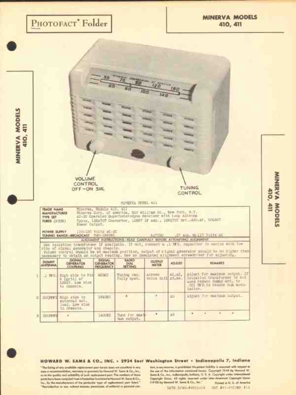 Vintage MINERVA models 410 & 411 4 tube AM radio receiver. Original old Sams Photofact manual includes schematics, layouts, alignment adjustments, parts list. 4 pages. Dated 1948. Minerva Corp of America, of New York, NY. This manual would make a sensational accompaniment to your vintage audio equipment.