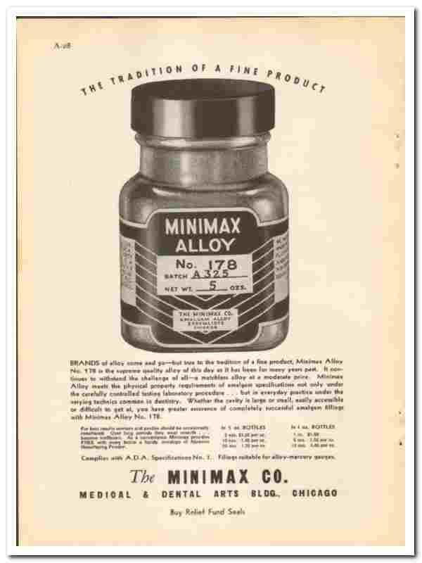 Products include the Minimax Alloy No 178. Brands of alloy come and go; but true to the tradition of a fine product, Minimax Alloy No. 178 is the supreme quality alloy of this day, as it has been for many years past. It continues to withstand the challenge of all; A matchless alloy at a moderate price. Minimax Alloy meets the physical property requirements of amalgam specifications, not only under the careful control testing laboratory procedure, but in everyday practice under the varying techniques common in dentistry. Whether the cavity is large or small, easily accessible or difficult to get at, you have greater assurance of completely successful amalgam fillings with Minimax Alloy No. 178.