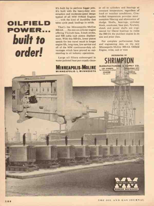 Original oil and gas trade magazine vintage ad for MINNEAPOLIS-MOLINE COMPANY of Minneapolis, MN. Oilfield Power Built to Order! MM Oilfield Engines. Distributed by Shrimpton Manufacturing & Supply Company of Los Angeles, CA. Unique 1954 old oil field petroleum industry pumping equipment magazine advertisement.