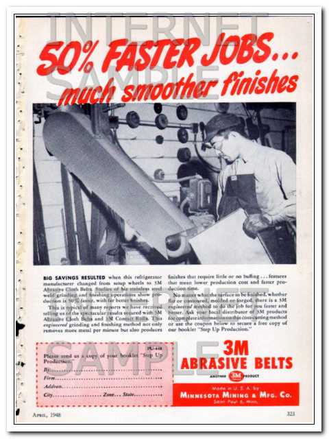 Original vintage magazine advertisement for MINNESOTA MINING AND MANUFACTURING COMPANY of Saint Paul, MN. 50% FASTER JOBS... much smoother finishes. Old 1948 industrial 3M advertisement.