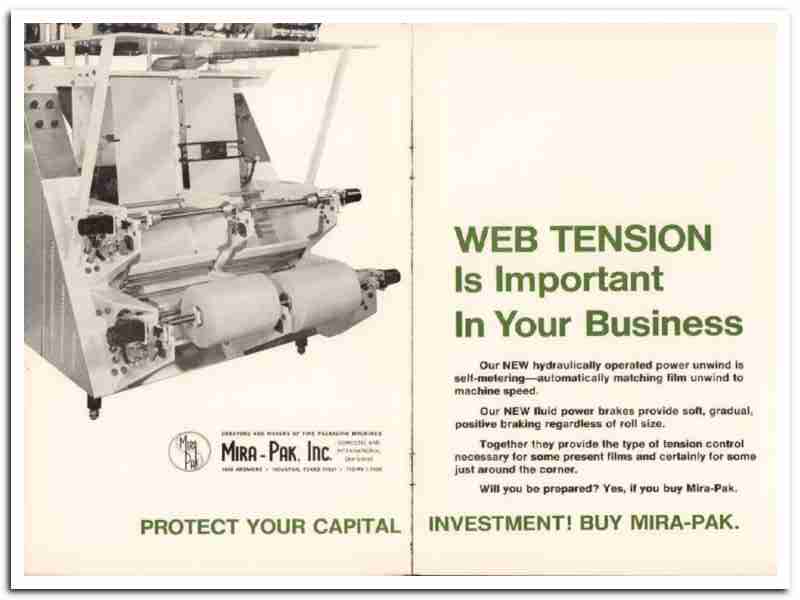Original 1967 potato chip trade magazine vintage ad for MIRA-PAK, INC. Main office and factory was located at 7000 Ardmore Street, Houston, Texas. Web Tension is important in your business. New hydraulically operated power unwind is self-metering ,automatically matching film unwind to machine speed. New fluid power brakes provide soft, gradual, positive braking regardless of roll size. This old two page snack food packaging equipment advertisement would display beautifully matted and framed.