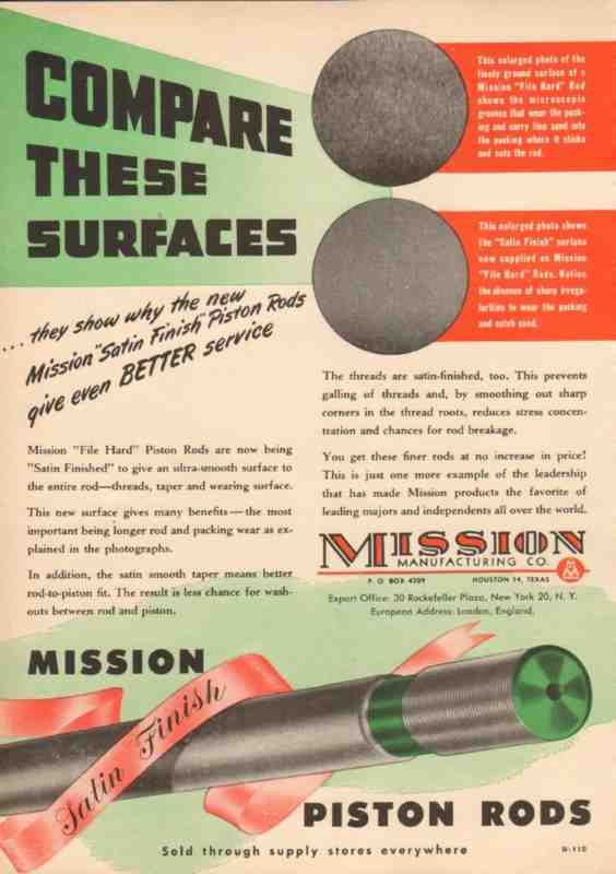 Original oil and gas trade magazine vintage ad for MISSION MANUFACTURING COMPANY of Houston, TX.  Compare Surfaces, show why Satin finish piston rods give even better service.  Favorite of leading majors and independents all over the world. This unique 1950 old oilfield petroleum well industry magazine advertisement would display beautifully matted and framed. Nice graphics.