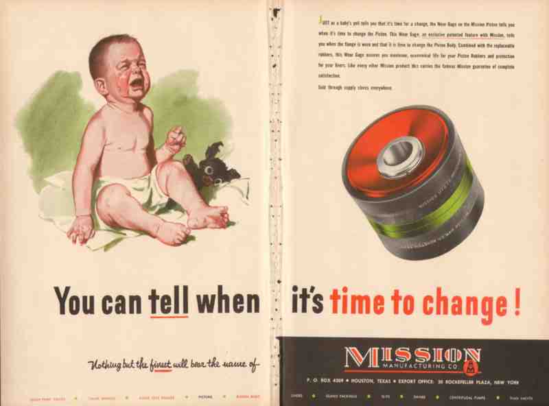 Original oil and gas trade magazine vintage ad for MISSION MANUFACTURING COMPANY of Houston, TX.  You can tell when it's time to change!  Just as a baby's yell, the wear gage on the piston tells you when it needs changing. This unique 1955 old oilfield petroleum industry equipment magazine advertisement would display beautifully matted and framed. Nice graphics. Two page gatefold advertisement.