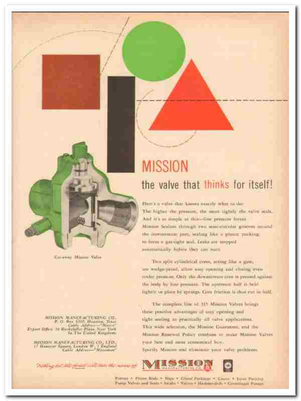 Original oil and gas trade magazine vintage ad for MISSION MANUFACTURING COMPANY. of Houston, TX.  Valve that thinks for itself. Oilfield industry equipment including pistons, liners, swabs. The higher the pressure, the more tightly the valve seals. Pressures force sealant through two semi-circular grooves around the downstream port, forming a gas-tight seal. Leaks are stopped before they can start. This unique 1959 old oilfield petroleum well valve equipment magazine advertisement would display beautifully matted and framed. Nice graphics.
