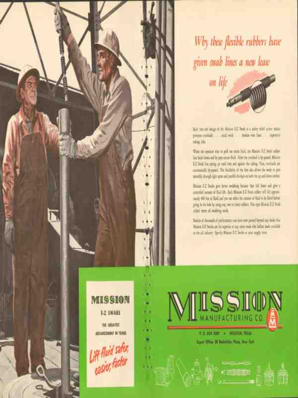 Original oil and gas trade magazine vintage ad for MISSION MANUFACTURING COMPANY of Houston, TX.   Flexible Rubbers Have Given Swab Lines a New Lease on Life. Mission E-Z Swabs. Unique 1953 old oilfield petroleum industry drilling equipment magazine advertisement. Two page gatefold advertisement.