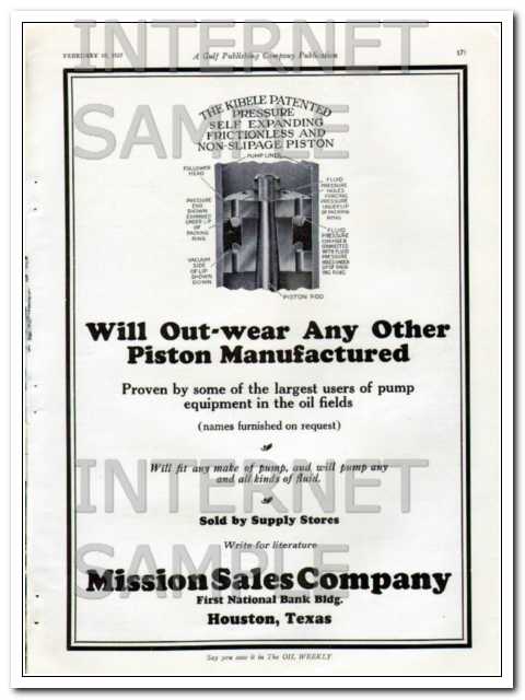 Original oil and gas trade magazine vintage ad for MISSION SALES COMPANY, was located in the First National Bank Building, Houston, TX. The Kibele Patented Pressure Self Expanding Frictionless and Non-Slippage Piston Will Outwear Any Other Piston Manufactured. Proven by some of the largest users of pump equipment in the oil fields. This unique 1927 old oilfield petroleum industry well drilling equipment magazine advertisement would display magnificently matted and framed. Nice graphics. Art deco.